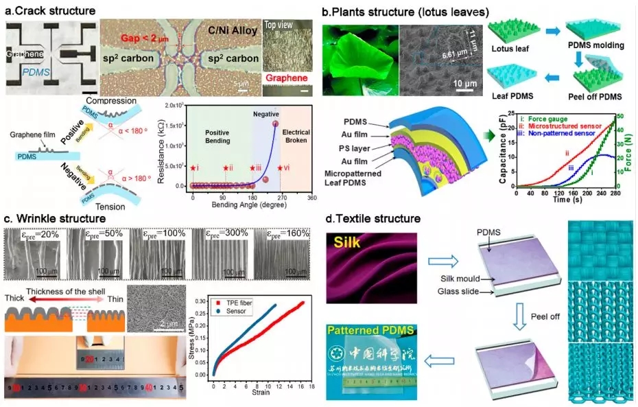 圖2. 基于(a)納米碳材料裂紋結構、(b)荷葉表面微納結構、(c)“wave”延展結構、(d)織物微納結構組裝的仿生柔性傳感器。