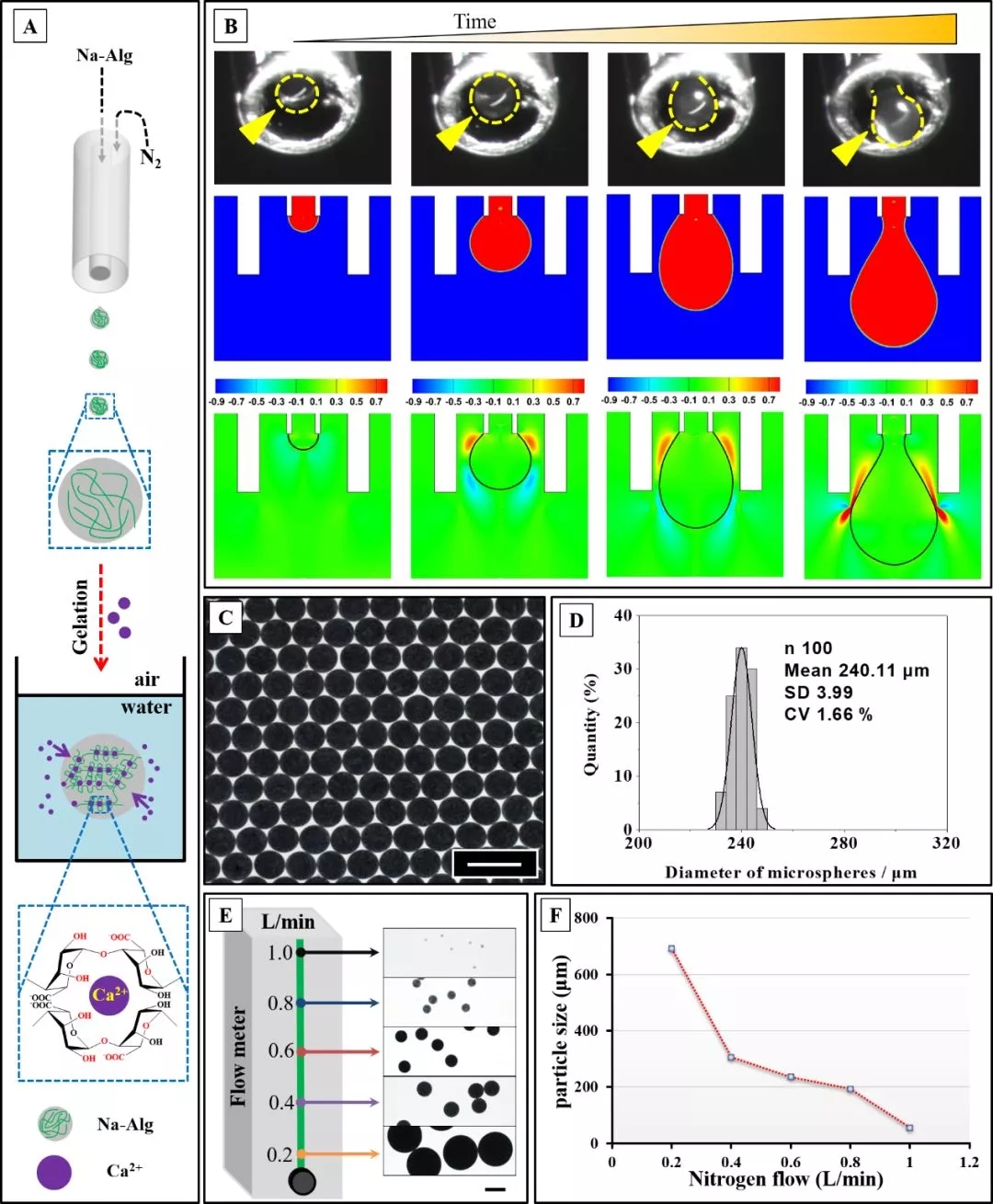 近日,南京林業大學黃超伯教授課題組在制備多面異向微球的研究中取得重要進展,課題組成員唐國勝將微流控技術和微加工手段與氣體相結合,構建了一種氣體剪切一步無油法制備多面異向微球。以海藻酸鈉為例,該方法借助氣體剪切力克服表面張力形成微液滴,并通過海藻酸鈉液滴與鈣離子的快速交聯形成微球,微球尺寸可以控制在數十到數百微米之間,具有很好的單分散性且產量極高(圖1)。