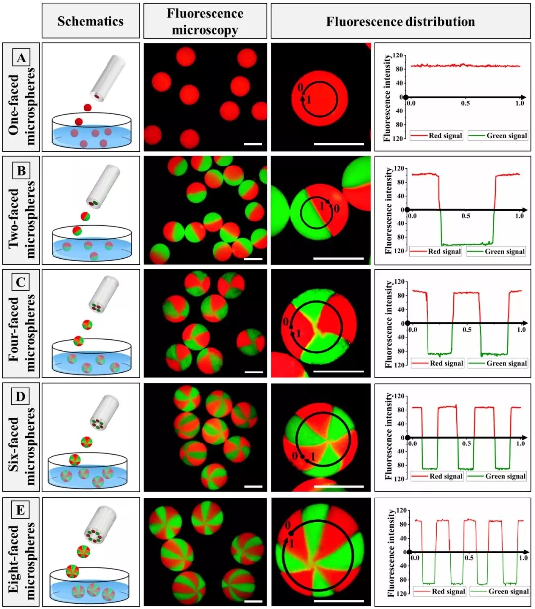 多面異向微球在醫學工程和材料科學領域中受到廣泛關注,由于單個微球可以在不同空間中攜帶多種材料,因此在多藥物釋放、細胞共培養、微驅動、多靶點檢測等領域有很多重要的應用。目前制備多面微球材料的方法主要包括微流體法、電沉積法、電噴法和模板法等,但由于各自的局限性,比如微流體的方法需要使用油、引發劑和表面活性劑等,這些方法在生物領域的應用受到一定限制。