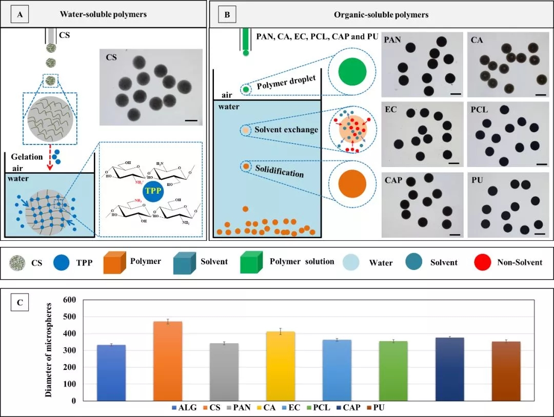 黃超伯教授說,在該研究中,除海藻酸鈉,我們還對水溶性聚合物(如殼聚糖)以及有機溶解聚合物(如醋酸纖維素、乙基纖維素、鄰苯二甲酸醋酸纖維素、聚己內酯、聚丙烯腈和聚氨酯)分別進行了成球實驗評價,結果顯示這些聚合物微球均可以成功制備(圖3),這證明該方法具有普適性和通用性。