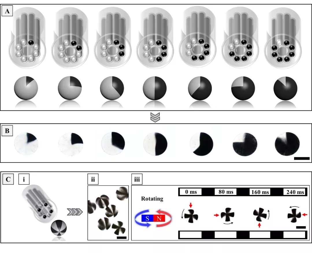 此外,該方法制備微球具有高度的可控性,可精確的控制每個腔室的比例。可以用來封裝、結合不同的控制策略(pH和溫度傳感、磁力控制等),進而開發出多種功能材料。該研究通過加載磁性Fe3O4納米顆粒制備出的八面微球可以實現可控旋轉,從而構建“磁性微機器人”(圖4)。
