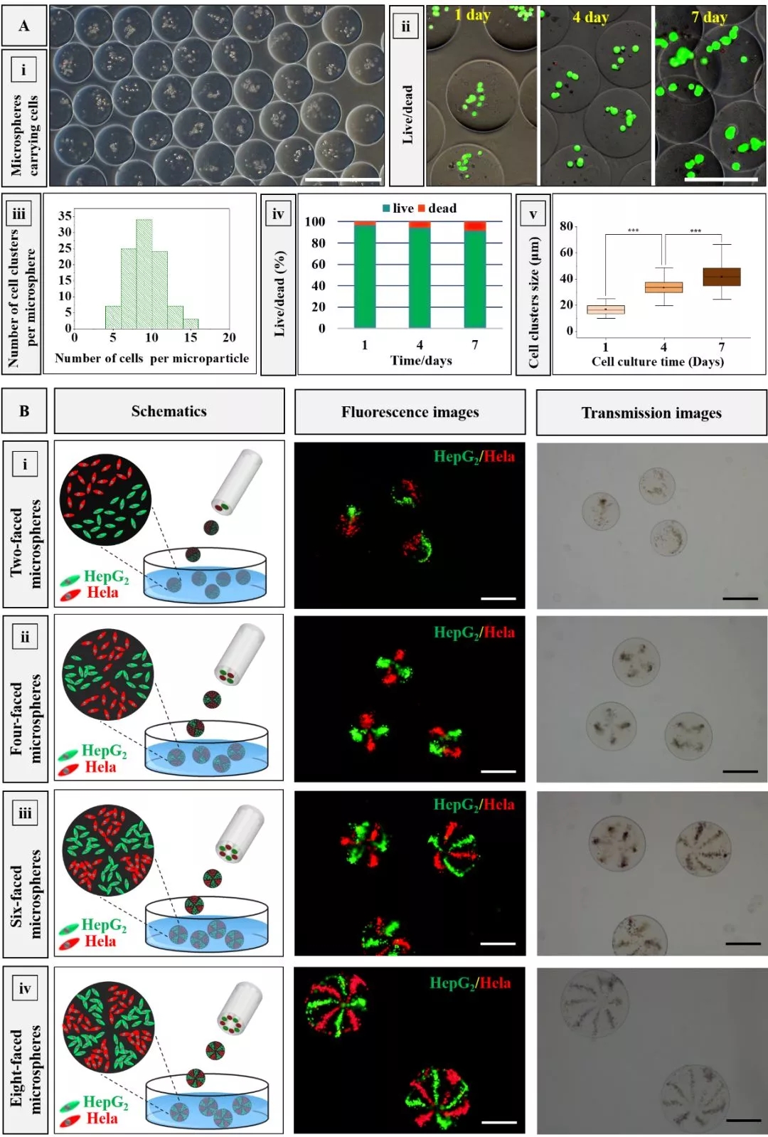在本研究中,鑒于該方法的 “軟”策略,多面異向微球表現出了超高的生物相容性,可實現多種細胞的有序組裝和任意編隊,在一個有限的微米大小的空間中精確地組裝不同類型的細胞。這將為研究不同細胞之間復雜的相互作用提供一個有效的平臺。該制備多面異向微球方法的建立代表著該領域的一個重大突破,有望在生物醫藥和材料科學領域實現重要的應用。