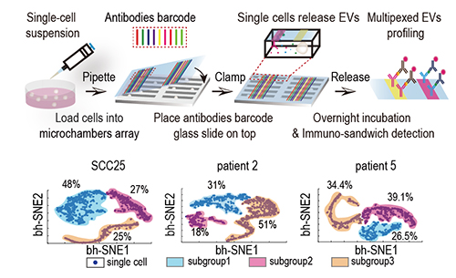 本項(xiàng)研究中,研究人員利用抗體條形碼陣列微流控芯片,實(shí)現(xiàn)了高通量同一單細(xì)胞來源的多種外囊泡的免疫分型;并將其應(yīng)用于口腔鱗癌細(xì)胞系及多例口腔鱗癌病人手術(shù)組織樣本原代細(xì)胞中,初步發(fā)現(xiàn)了腫瘤轉(zhuǎn)移相關(guān)的外囊泡亞群;還實(shí)現(xiàn)了對(duì)同一單細(xì)胞的分泌蛋白與外囊泡的多指標(biāo)、并行分析,發(fā)現(xiàn)蛋白與外囊泡的分泌由不同的細(xì)胞亞群來主導(dǎo)。